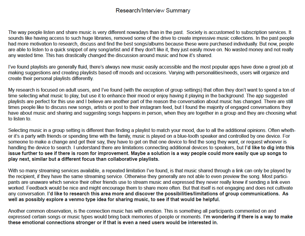 We then did an initial round of interviews to discover how these services are used and to look into the social aspect of sharing music. After evaluating those results, we decided to focus specifically on listening to music in group settings and perform another round of interviews.